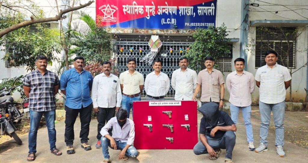 सांगली : स्थानिक गुन्हे अन्वेषण शाखेच्या पथकाने अवैध अग्निशस्त्र विक्री करणाऱ्या दोन सराईत आरोपींना सापळा रचून अटक केली असून त्यांच्या ताब्यातून पाच देशी बनावटीच्या गावठी पिस्तुलांसह १२ जिवंत काडतुसे असा एकूण ३,३२,५०० रुपयांचा मुद्देमाल जप्त करण्यात आला आहे.
