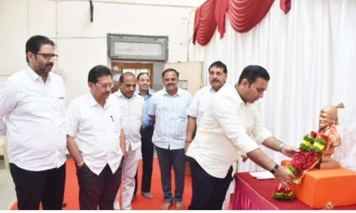 महाराष्ट्राचे आराध्य दैवत छञपती शिवाजी महाराज यांच्या पुतळ्यास अभिवादन करताना संघाचे चेअरमन नविद मुश्रीफ, माजी चेअरमन व ज्येष्ठ संचालक अरुण डोंगळे, संचालक अजित नरके, अंबरिषसिंह घाटगे, प्रकाश पाटील, संभाजी पाटील व संघाचे अधिकारी व कर्मचारी आदि दिसत आहेत.