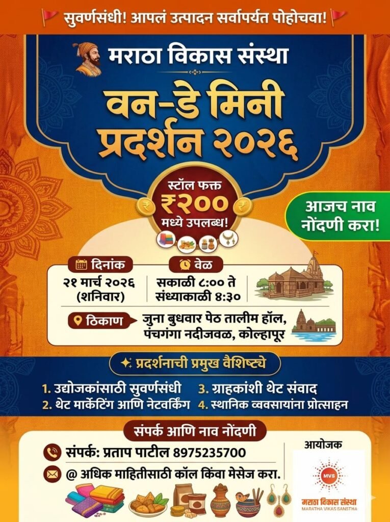 कोल्हापूर : स्थानिक उद्योजक, गृहउद्योग व लघु व्यवसायिकांना आपल्या उत्पादनांना बाजारपेठ उपलब्ध करून देण्यासाठी मराठा विकास संस्था यांच्या वतीने वन डे मिनी प्रदर्शनाचे आयोजन करण्यात आले आहे.