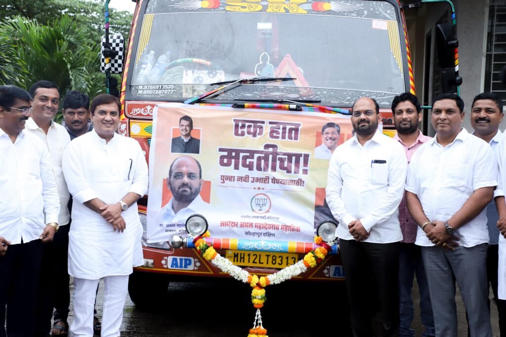 कोल्हापूर : महाराष्ट्रात विशेषतः मराठवाड्यात पावसाने थैमान घातले आहे. अनेक जिल्ह्यांमध्ये अतिवृष्टी झाल्यामुळे महापूर आला आहे. लोकांच्या घराशिवारात पाणी शिरल्यामुळे जनजीवन विस्कळीत झाले आहे. हजारो कुटुंबांना पुराचा फटका बसला आहे. मुख्यमंत्री देवेंद्र फडणवीस यांच्यासह राज्य मंत्रिमंडळातील अनेक मंत्री महापुराची पाहणी करून तातडीची मदत देण्यात गुंतले आहेत. त्याचबरोबर पूरग्रस्तांसाठी राज्यभरातून मदत पाठवण्यात येत आहे. कोल्हापूर दक्षिण विधानसभा मतदारसंघाचे आमदार अमल महाडिक यांनी स्वखर्चातून सोलापूर जिल्ह्यातील १५०० पूरग्रस्त कुटुंबांना जीवनावश्यक साहित्याचे वितरण करण्याचा निर्णय घेतला.एका कुटुंबाला १५ दिवस पुरेल इतके धान्य, डाळी, तेल, साबण, टूथपेस्ट, ब्लँकेट अशा जीवनावश्यक वस्तूंचे किट बनवण्यात आले आहे. नागाळा पार्क इथल्या भारतीय जनता पार्टीच्या जिल्हा कार्यालयात खासदार धनंजय महाडिक आमदार अमल महाडिक यांच्या प्रमुख उपस्थितीत हे साहित्य ट्रकमधून सोलापूरकडे रवाना करण्यात आले. यावेळी भाजपचे महानगर जिल्हाध्यक्ष विजय जाधव उपस्थित होते. यावेळी बोलताना खासदार धनंजय महाडिक यांनी, अमल महाडिक यांनी राबवलेला उपक्रम अनुकरणीय आहे असे मत व्यक्त केले. कोल्हापूरवर जेव्हा महापुराचे संकट ओढवले तेव्हा महाराष्ट्रभरातून मदत येत होती. आता कोल्हापूरकरांनीही मराठवाड्याच्या मदतीला धावून जात माणुसकीचे दर्शन घडवले आहे. अमल महाडिक यांची मदत ही चांगली सुरुवात असून जिल्हाभरातून भारतीय जनता पार्टीचे कार्यकर्ते मोठ्या संख्येने मदत गोळा करून पूरग्रस्त भागात पाठवतील अशी ग्वाही खासदार महाडिक यांनी दिली.